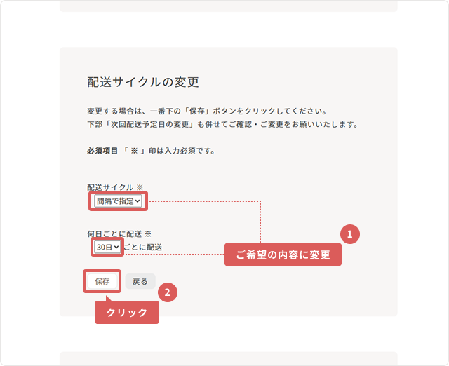 4「配送サイクル」よりご希望の内容に応じて変更し、「保存」を押してください。
