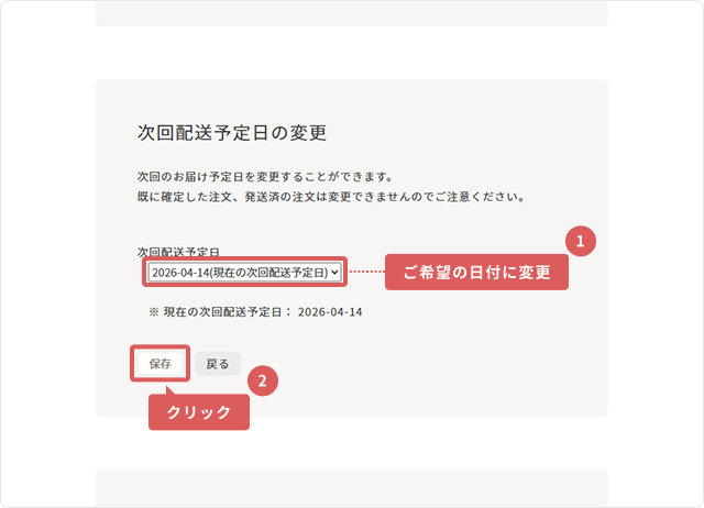 4「次回配送予定日の変更」よりご希望の日付に変更し、「保存」を押してください。