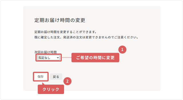 4「定期お届け時間の変更」よりご希望の時間に変更し、「保存」を押してください。