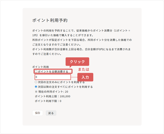 「ポイント数を入力」のどちらかの入力が無い場合は保存ができません。