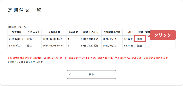 2「定期注文一覧」の該当定期注文の「詳細」を押してください。