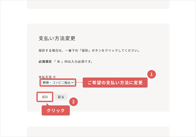 4「支払い方法変更」よりご希望の支払い方法に変更し、「保存」を押してください。