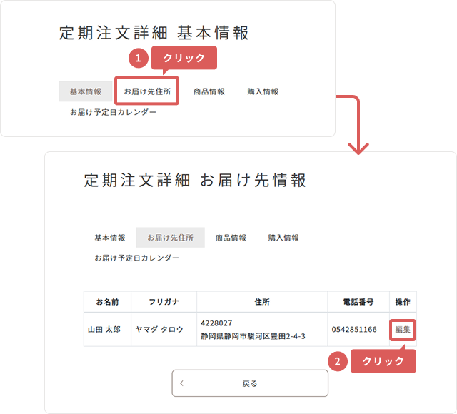 3「お届け先住所」タブ内「操作」の「編集」を押してください。