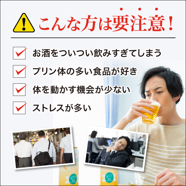通常プリン体は体内で尿酸になって排出されますが、プリン体を含む食品を多く摂りすぎてしまうと、排出しきれない尿酸が体内に残って尿酸値が上がる原因になります。
