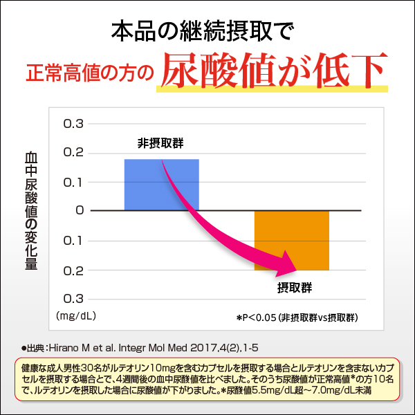 健康な成人男性30名がルテオリン10mgを含むカプセルを摂取する場合とルテオリンを含まないカプセルを摂取する場合とで、4週間後の血中尿酸値を比べました。そのうち尿酸値が正常高値*の方10名で、ルテオリンを摂取した場合に尿酸値が下がりました。*尿酸値5.5mg/dL超〜7.0mg/dL未満