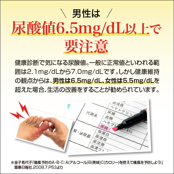 健康診断で気になる尿酸値。一般に正常値といわれる範囲は2.1mg/dLから7.0mg/dLです。しかし健康維持の観点からは、男性は6.5mg/dL、女性は5.5mg/dLを超えた場合、生活の改善をすることが勧められています。