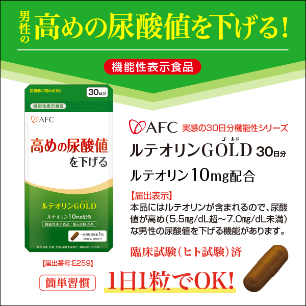 本品にはルテオリンが含まれるので、尿酸値が高め(5.5mg/dL超〜7.0mg/dL未満)な男性の尿酸値を下げる機能があります。
