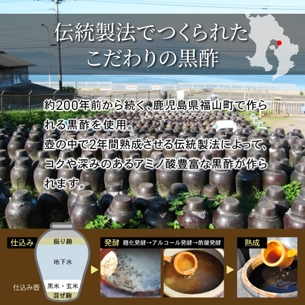 約200年前から続く、鹿児島県福山町で作られる黒酢を使用。