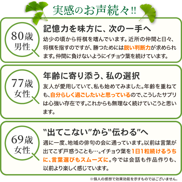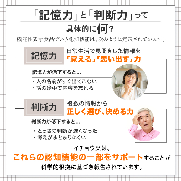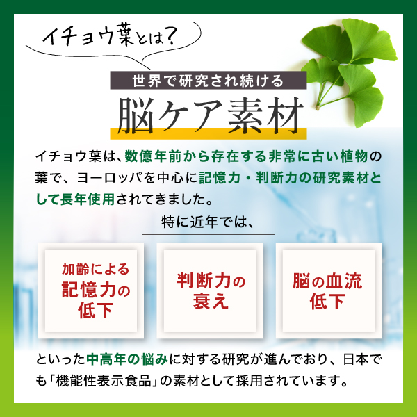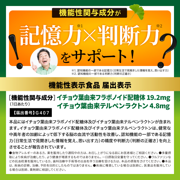 【届出表示】本品にはイチョウ葉由来フラボノイド配糖体及びイチョウ葉由来テルペンラクトンが含まれます。イチョウ葉由来フラボノイド配糖体及びイチョウ葉由来テルペンラクトンは、健常な中高年者の加齢によって低下する脳の血流や活動性を改善し、認知機能の一部である記憶力(日常生活で見聞きした情報を覚え、思い出す力)の精度や判断力(判断の正確さ)を向上させることが報告されています。