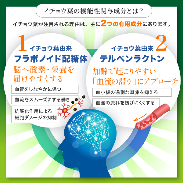 本品にはイチョウ葉由来フラボノイド配糖体及びイチョウ葉由来テルペンラクトンが含まれます。イチョウ葉由来フラボノイド配糖体及びイチョウ葉由来テルペンラクトンは、健常な中高年者の加齢によって低下する脳の血流や活動性を改善し、認知機能の一部である記憶力(日常生活で見聞きした情報を覚え、思い出す力)の精度や判断力(判断の正確さ)を向上させることが報告されています。