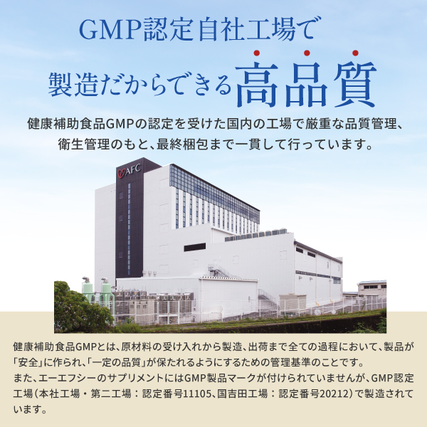 また、エーエフシーのサプリメントにはGMP製品マークが付けられていませんが、GMP認定工場(本社工場・第二工場:認定番号11105、国吉田工場:認定番号20212)で製造されています。
