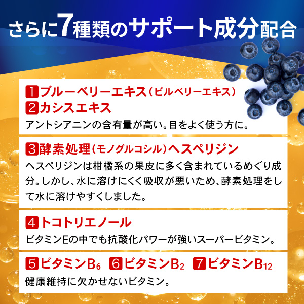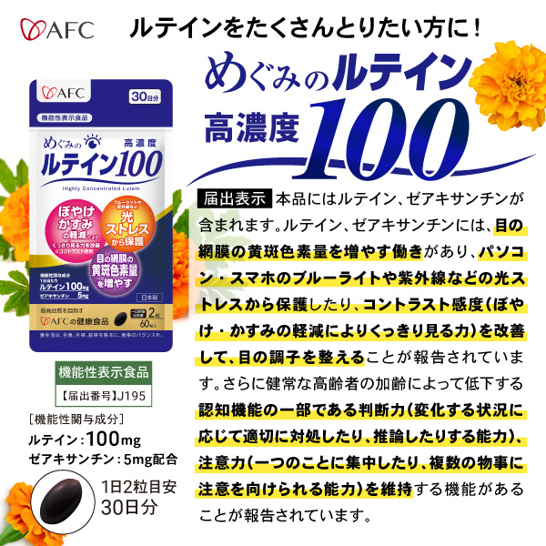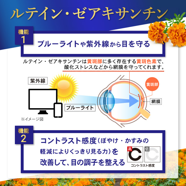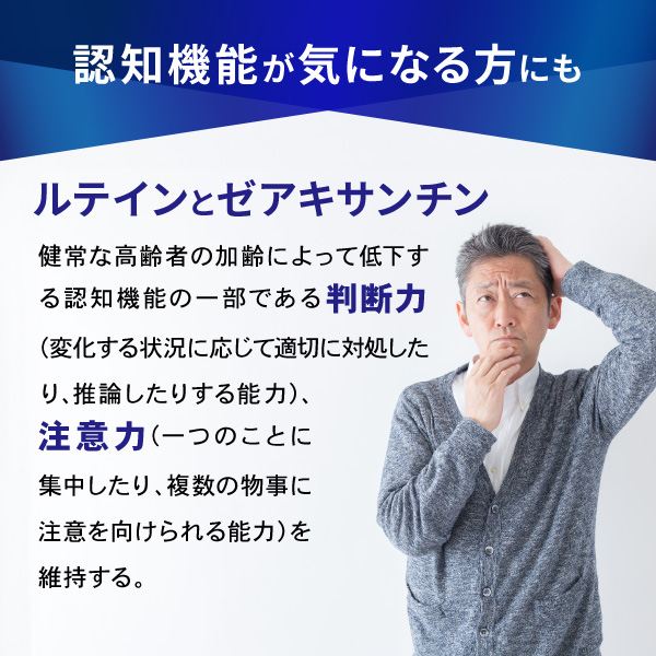 【届出表示】本品にはルテイン、ゼアキサンチンが含まれます。ルテイン、ゼアキサンチンには、目の網膜の黄斑色素量を増やす働きがあり、パソコン・スマホのブルーライトや紫外線などの光ストレスから保護したり、コントラスト感度(ぼやけ・かすみの軽減によりくっきり見る力)を改善して、目の調子を整えることが報告されています。さらに健常な高齢者の加齢によって低下する認知機能の一部である判断力(変化する状況に応じて適切に対処したり、推論したりする能力)、注意力(一つのことに集中したり、複数の物事に注意を向けられる能力)を維持する機能があることが報告されています。