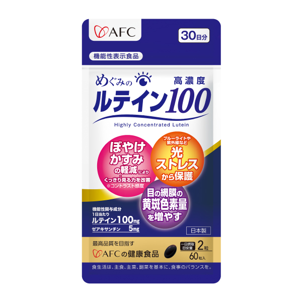 めぐみのルテイン高濃度100は、ルテインの量が30から100に増え、さらにサポート成分を7種類配合。より実感したい方