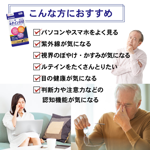 パソコンやスマホをよく見る方、紫外線が気になる方、ルテインをたくさんとりたい方、40歳以上の方、目の健康が気になる方、判断力や注意力などの認知機能が気になる方、1日2粒の高濃度ルテインで健康的な毎日を送りましょう!