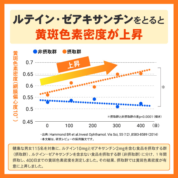 健康な男女115名を対象に、ルテイン10mgとゼアキサンチン2mgを含む食品を摂取する群(摂取群)、ルテイン・ゼアキサンチンを含まない食品を摂取する群(非摂取群)に分け、1年間摂取し、400日までの黄斑色素密度を測定しました。その結果、摂取群では黄斑色素密度が有意に上昇しました。