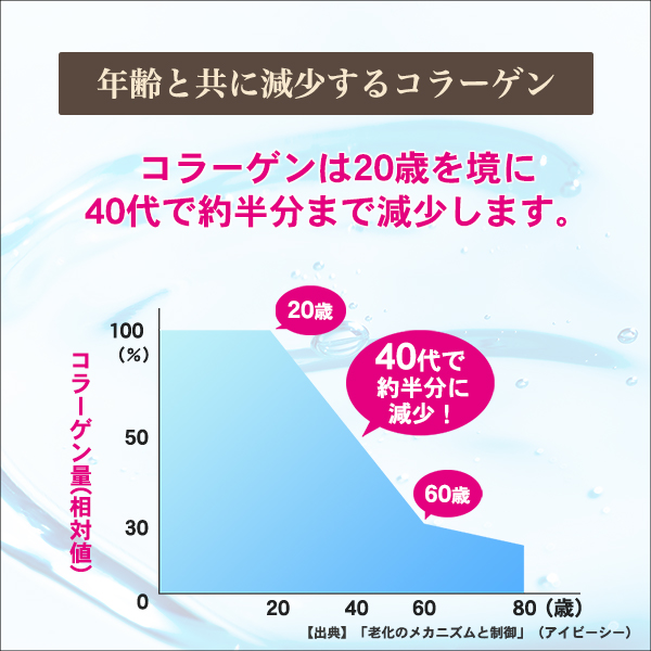 コラーゲンは20歳を境に40代で約半分まで減少します。