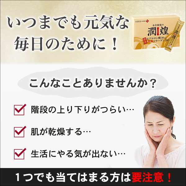 年齢を重ねるごとにうるおいは失われます。うるおいがないと皮膚や関節などトラブルの原因に…。ヒアルロン酸は、たった1gで約6ℓの水分を保持!だから、いつまでもうるおった若々しい身体に!