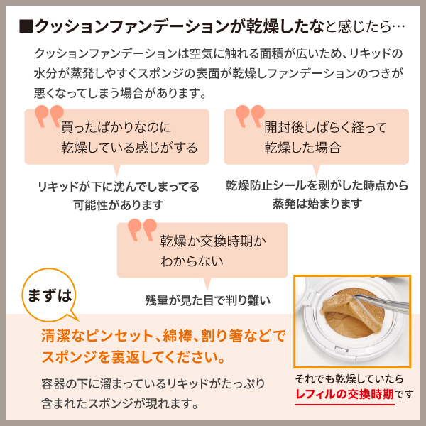 クッションファンデーションは空気に触れる面積が広いため、リキッドの水分が蒸発しやすくスポンジの表面が乾燥しファンデーションのつきが悪くなってしまう場合があります。