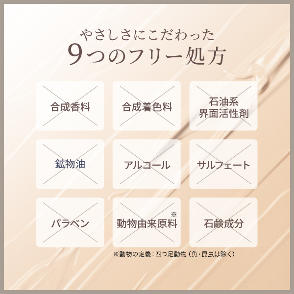 合成香料不使用、合成着色料不使用、石油系界面活性剤不使用、鉱物油不使用、アルコール不使用、サルフェート不使用、パラベン不使用、動物由来原料不使用※、石鹼成分不使用