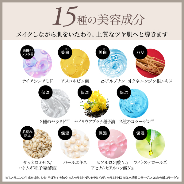 ナイアシンアミド(美白※1・シワ改善)、アスコルビン酸(美白※1)、α-アルブチン(美白※1)、オタネニンジン根エキス(ハリ)、3種のセラミド※2(保湿)、セイヨウアブラナ種子油(保湿)、2種のコラーゲン※3(保湿)、サッカロミセス/ハトムギ種子発酵液(肌荒れ防止)、パールエキス(保湿)、ヒアルロン酸Na/アセチルヒアルロン酸Na(保湿)、フィトステロールズ(保湿)