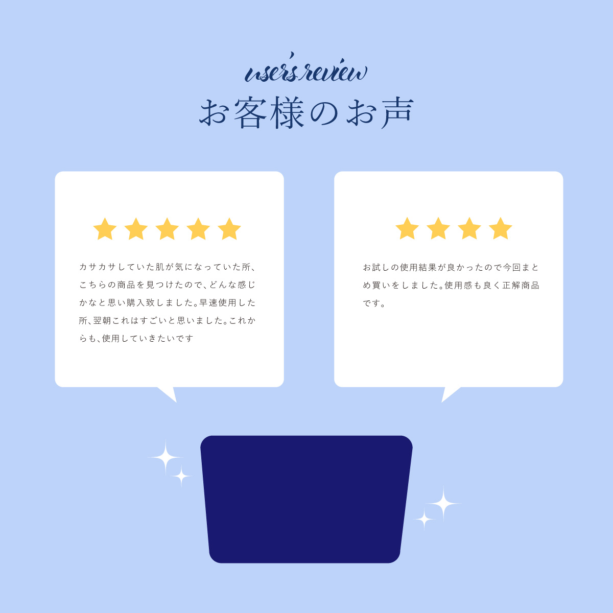 お肌を整えた後に手のひらにとり、お肌全体を包み込むように優しくなじませてそのままお休みください。