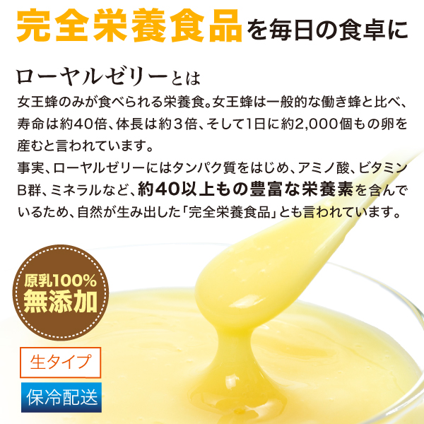 中国産の原乳生ローヤルゼリーを100%使用。高価なローヤルゼリーを、よりお求めやすくしました。冷凍状態でお届けします。