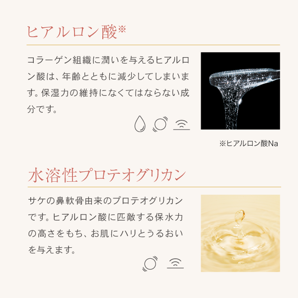 サケの鼻軟骨由来のプロテオグリカンです。ヒアルロン酸に匹敵する保水力の高さをもち、お肌にハリとうるおいを与えます。