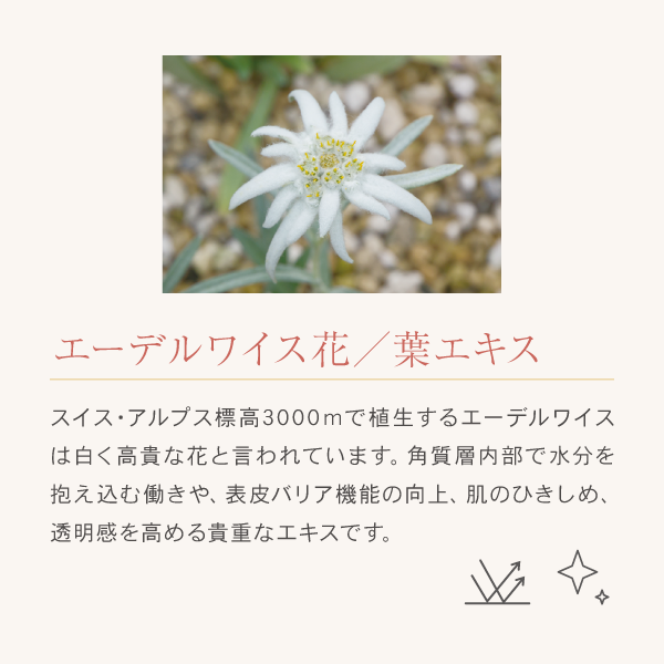 スイス・アルプス標高3000mで植生するエーデルワイスは白く高貴な花と言われています。角質層内部で水分を抱え込む働きや、表皮バリア機能の向上、肌のひきしめ、透明感を高める貴重なエキスです。