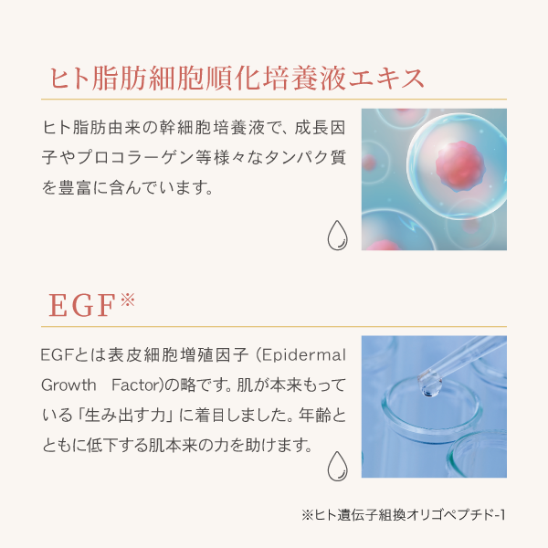EGFとは表皮細胞増殖因子(Epidermal Growth Factor)の略です。肌が本来もっている「生み出す力」に着目しました。年齢とともに低下する肌本来の力を助けます。