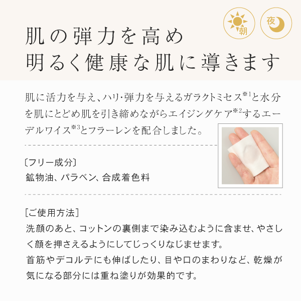[ご使用方法]:洗顔のあと、コットンの裏側まで染み込むように含ませ、やさしく顔を押さえるようにしてじっくりなじませます。首筋やデコルテにも伸ばしたり、目や口のまわりなど、乾燥が気になる部分には重ね塗りが効果的です。