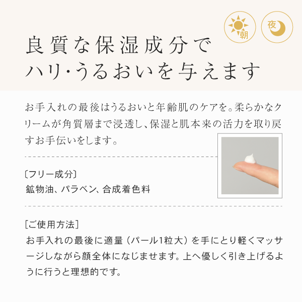 お手入れの最後はうるおいと年齢肌のケアを。柔らかなクリームが角質層まで浸透し、保湿と肌本来の活力を取り戻すお手伝いをします。