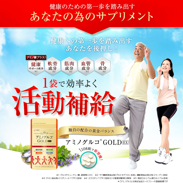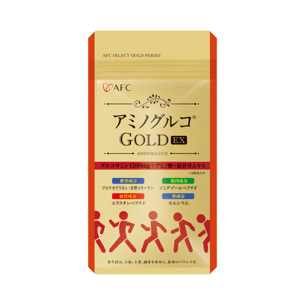 いつまでも健康なフシブシで自分のチカラで歩き続けるために必要なことは、普段のバランスの良い食事と、スムーズさを保つ軟骨成分、カラダを支える骨成分、力強く歩くための筋肉成分を一緒に補うことでした。AFC「アミノグルコGOLD EX」は、軟骨成分 筋肉成分 骨成分 血管成分に加え、グルコサミンやアミノ酸を毎日摂れる商品となっています。