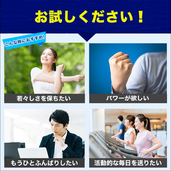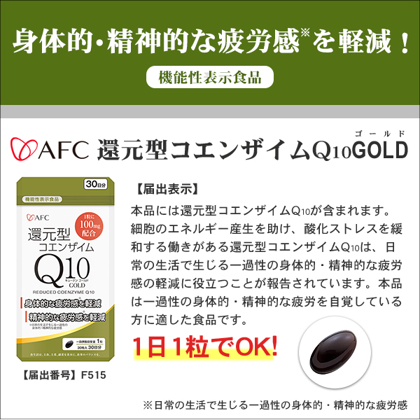 コエンザイムQ10には「還元型」と「酸化型」があり、人の体内に存在するのは「還元型」です。AFCの「還元型コエンザイムQ10」は体内にある形そのままなので、本来の力をダイレクトに届けます。疲れがたまっている方、パワーが欲しい方、もうひとふんばりしたい方、活動的な毎日を送りたい方におすすめです。