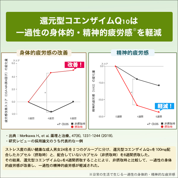 その結果、還元型コエンザイムQ10を4週間摂取することにより、非摂取時と比較して、一過性の身体的疲労感が改善し、一過性の精神的な疲労感が軽減された。