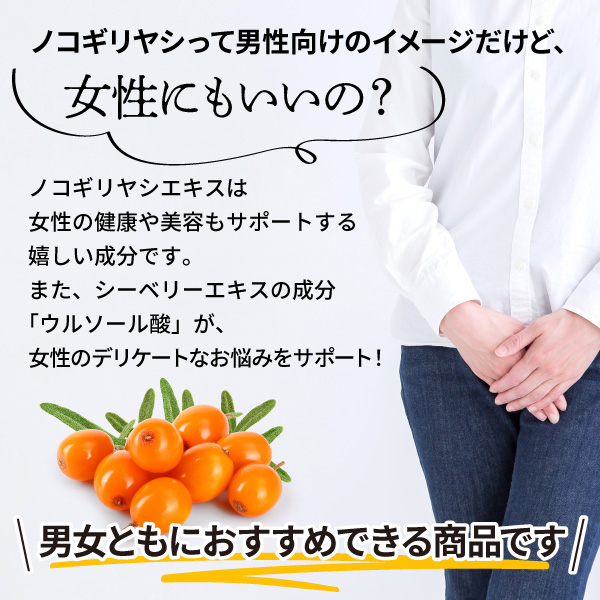 ノコギリヤシって男性向けのイメージだけど、実はノコギリヤシエキスが女性に健康や美容もサポートする嬉しい成分です。 また、シーベリーエキスの成分「ウルソール酸」が、女性のデリケートなお悩みをサポートする。