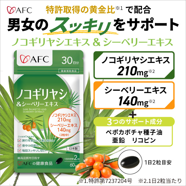 ノコギリヤシエキスを主成分に、シーベリーエキスをプラスしました。特許※取得の黄金比3:2で配合、さらに、3つのサポート成分※を加えて、男性・女性両方のスッキリをサポート!