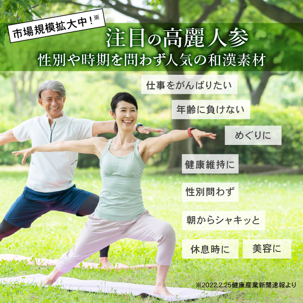 健康成分ジンセノサイドを含まれる高麗人参は、中高年だけに限らず、老若男女の間で健康や美容の維持に役立つ成分として注目を集めている健康素材です。