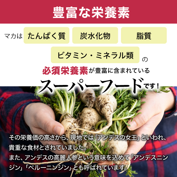 マカはたんぱく質、炭水化物、脂質、ビタミン・ミネラル類の必須栄養素が豊富に含まれているスーパーフードです!
