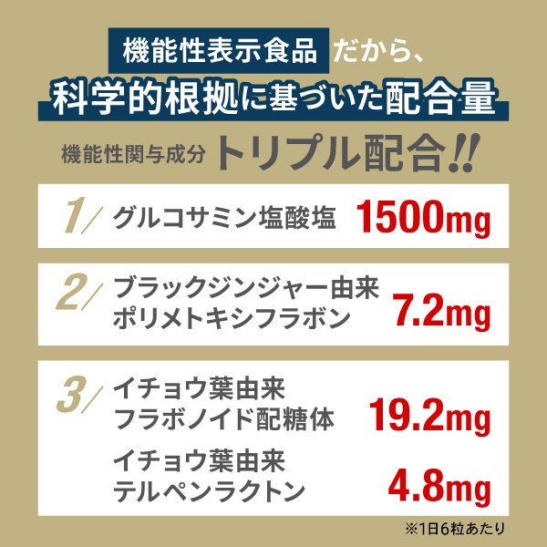【機能性関与成分】①グルコサミン塩酸塩 1500mg、②ブラックジンジャー由来ポリメトキシフラボン 7.2mg、③イチョウ葉由来フラボノイド配糖体 19.2mg、イチョウ葉由来テルペンラクトン 4.8mg