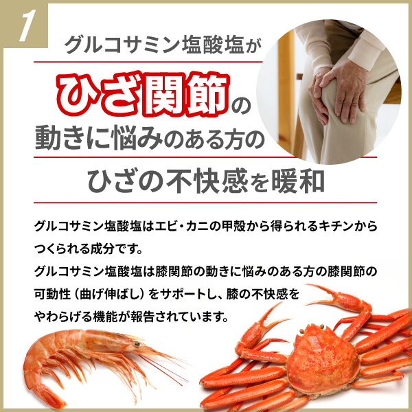 グルコサミン塩酸塩は膝関節の動きに悩みのある方の膝関節の可動性(曲げ伸ばし)をサポートし、膝の不快感をやわらげる機能が報告されています。