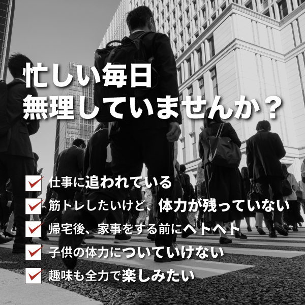 仕事に追われている方、筋トレしたいけど体力が残っていない方、子供の体力についていけない方に1日4粒で元気を急速チャージ!