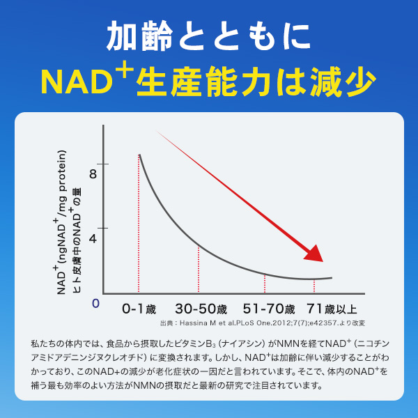 NMN(ニコチンアミドモノヌクレオチド)はエネルギー産生に必要な補酵素で、加齢に伴い減少してしまいます。健康維持関連の研究がますます盛んとなっている中、近年注目されているNMNをサプリにしてリニューアルしました。