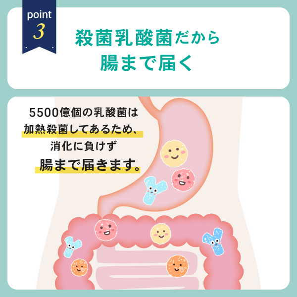 5500億個の乳酸菌は加熱殺菌してあるため、消化に負けず腸まで届きます。
