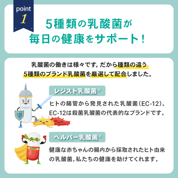 乳酸菌の働きは様々です。だから種類の違う5種類のブランド乳酸菌を厳選して配合しました。