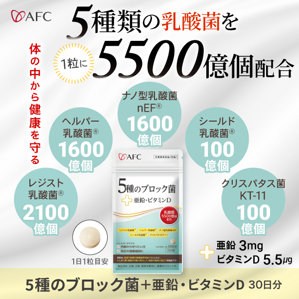 ヨーグルト約55杯(5.5kg)分※の乳酸菌を、1粒にぎゅっと配合しました。こだわりの5種類の乳酸菌が、毎日の健康をサポートします。さらに、健康意識の高い方に人気の亜鉛とビタミンDを配合。