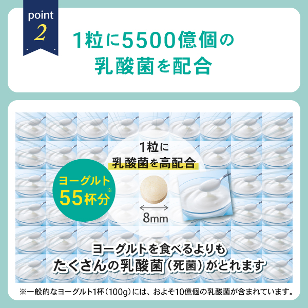 1粒に5種類の乳酸菌を5500億個配合。体の中から健康を守る!