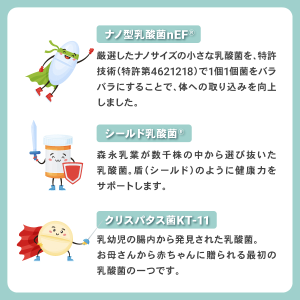 【シールド乳酸菌Ⓡ】:森永乳業が数千株の中から選び抜いた乳酸菌。盾(シールド)のように健康力をサポートします。