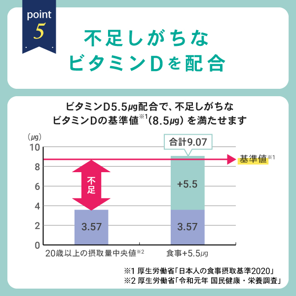 ビタミン (5.5µg)配合で、不足しがちなビタミンDの基準値 (8.5µg)を満たせます。(画像をご参照ください)