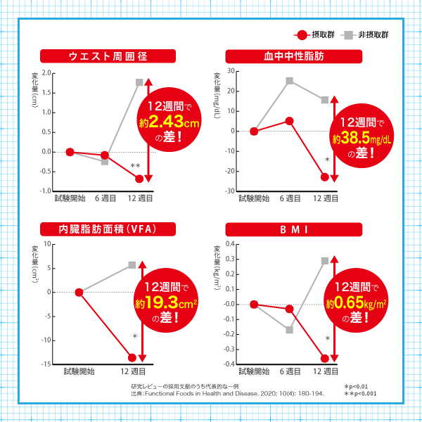 試験結果:体重、体脂肪、ウエスト周囲径、血中中性脂肪、内臓脂肪、BMIの各変化量が有意に低下しました。