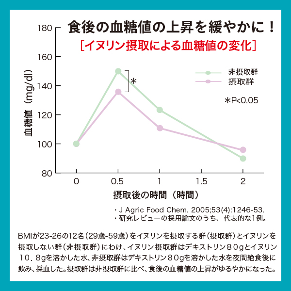 本品にはイヌリンが含まれています。イヌリンは血中中性脂肪を下げることが報告されています。また、イヌリンは食後の血糖値の上昇をゆるやかにすることが報告されています。